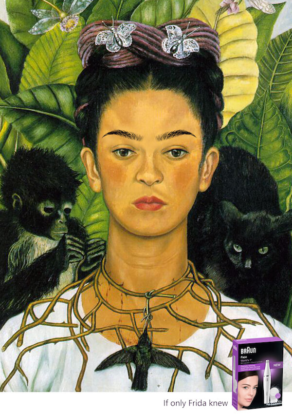 Braun’un 2017 yılında yeni epilasyon cihazını tanıtmak için yayınladığı reklam afişinde Frida Kahlo’nun hayatı boyunca almadığı kaş ve bıyıkları kesilmiş bir şekilde resmedilerek ''Frida bunu bir bilseydi'' sloganı kullanılmıştır. Gelen tepkilerin ardından kaldırılan reklamda kadınlara belirli güzellik kalıplarının dayatılmaya çalışıldığı açıkça görülmektedir.